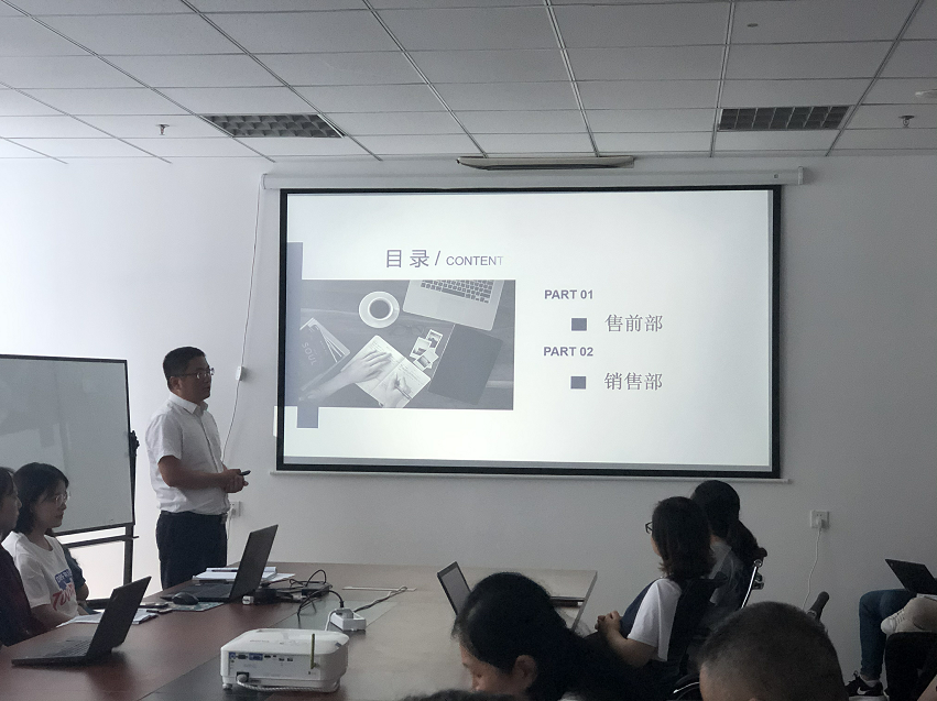 我司集成售后部经理贾盟,因售后团队更加壮大,为大家进行了现有人员的人员介绍,他提出,售后部像是流水线上的最后一个环节,为了保证工期要求,更应该增加技术力量;并对上半年的工作完成情况做出了展示;同时,贾盟提出,下半年的工作重点应该放在开展项目培训、开展项目管理方法培训、加快团队建设、提升服务质量上。