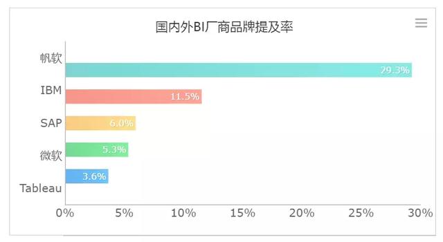 在市场知名度方面(品牌提及率,提到BI想到的厂商品牌),帆软以29.27%的品牌提及率一马当先,IBM以11.54%、SAP以5.98%分列榜眼、探花,微软以5.34%位居第四,Tableau以3.63%位居第五。